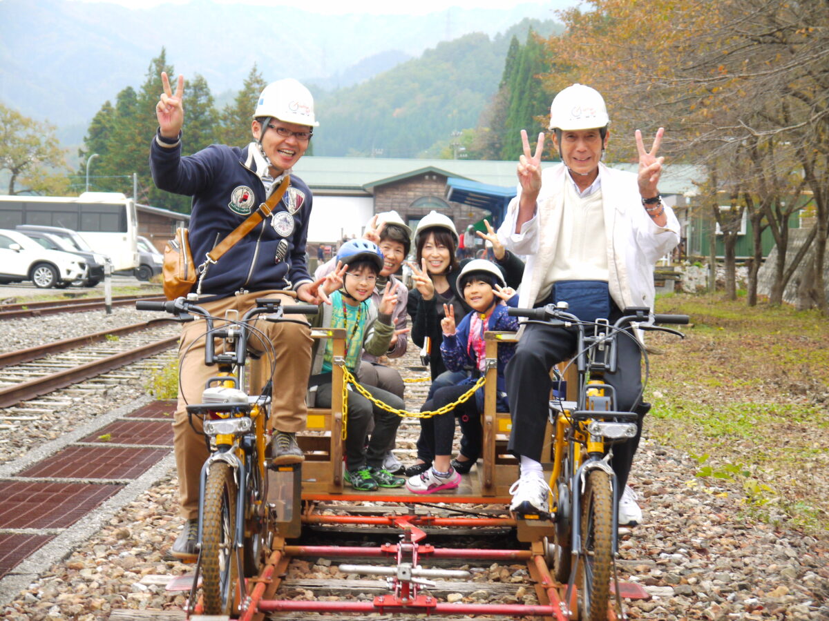 行きは自転車がトロッコを引っ張ってみんなでそろって